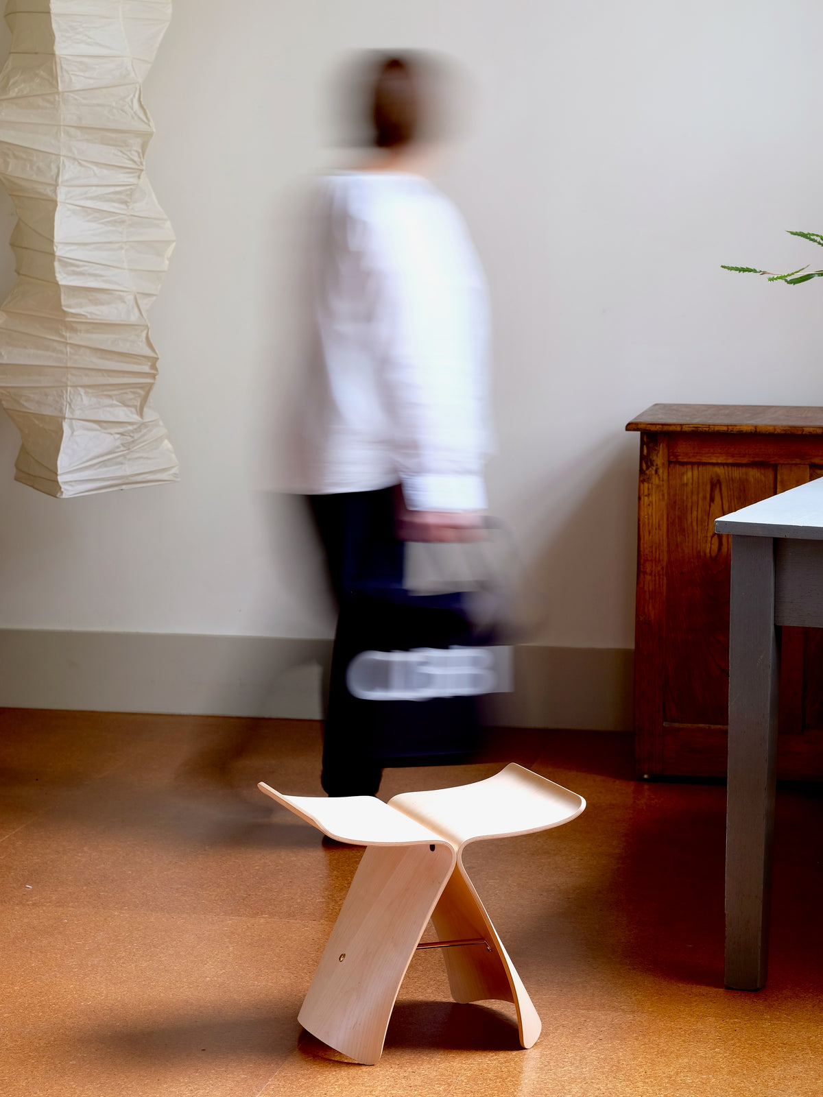 The Sori Yanagi butterfly stool was designed in 1956. It’s meticulously made by Tendo Mokko and is still the best seller. Reminiscent of a ribbon, butterfly or flower, its form is subject to the viewer's perspective. It was designed by hand with paper without any drawing. Yanagi was playing with paper with no plan in mind and came up with the shape by accident. He always designs using his hands. His design process is very long and always through making models by hand.